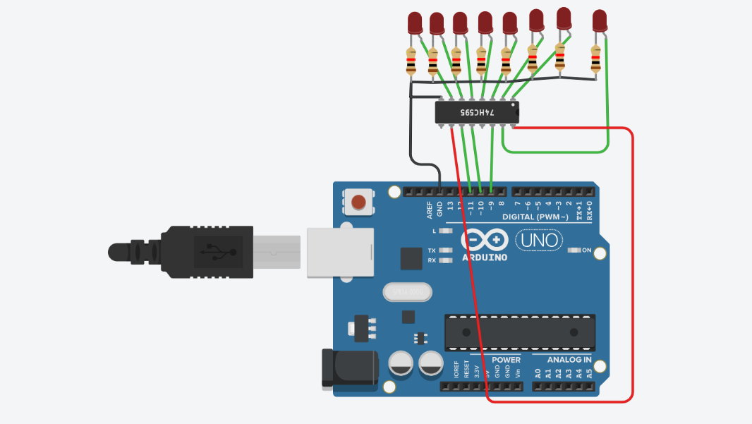 Суть работы данной микросхемы - преобразование последовательного сигнала от управляющего устройства (в нашем случае от Ардуино) в паралельный сигнал (тут на нем горят светодиоды). Подключая последовательно такие регистры можно управлять большим количеством диодов, так же по трем проводам.