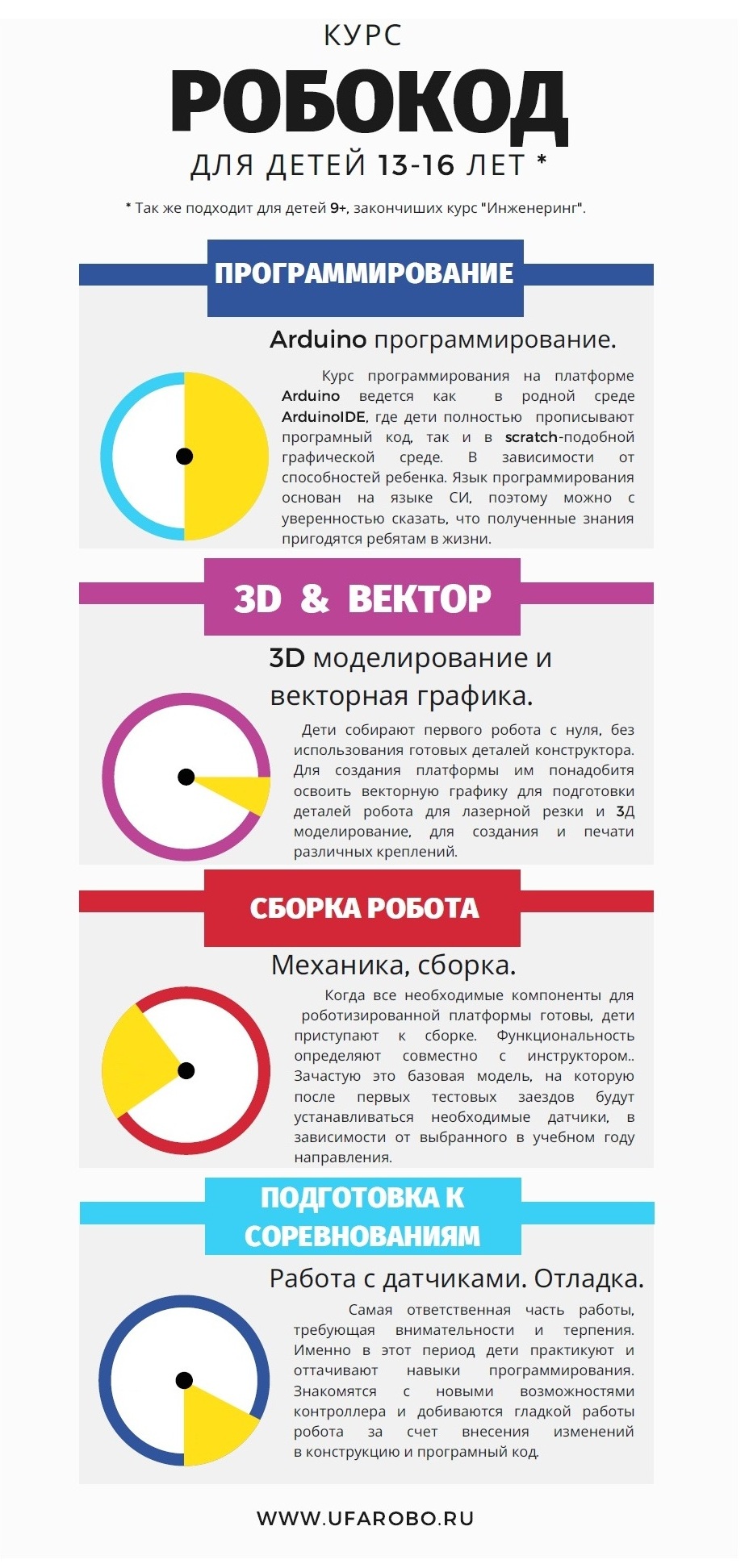 Первый учебный месяц ребята будут изучать (для тех, кто перешёл с первого курса - повторять) радиоэлектронику, механику. Учиться пользоваться макетными платами и паять. Со второго учебного месяца начинается курс программирования на Arduino - язык программирования основан на языке С++, поэтому можно с уверенностью сказать, что полученные знания пригодятся ребятам в жизни.